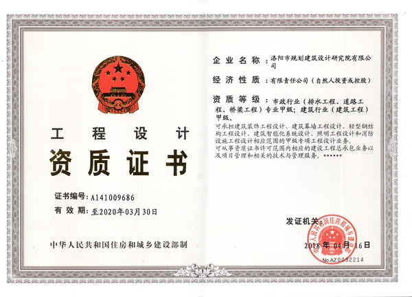 4月18日,住建部發(fā)布第52號公告《住房城鄉(xiāng)建設(shè)部關(guān)于核準2018年度第三批建設(shè)工程企業(yè)資質(zhì)資格名單的公告》,公司橋梁工程、排水工程設(shè)計資質(zhì)順利通過審查成功晉升為甲級資質(zhì),這是公司繼道路工程資質(zhì)升甲之后資質(zhì)升級增項工作的又一重大突破。